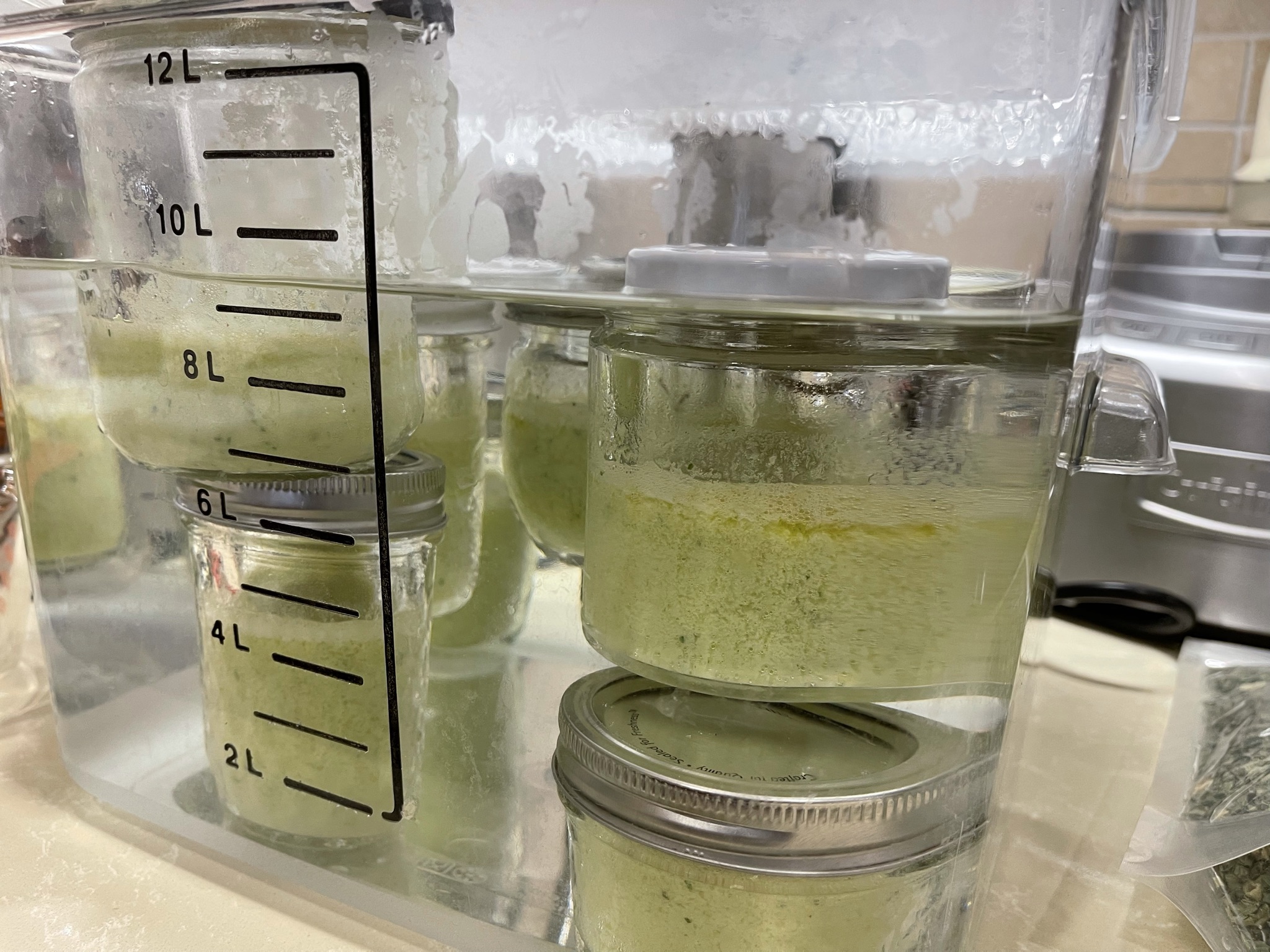 Preheat sous vide to 170F. Use enough water to just cover your jars.