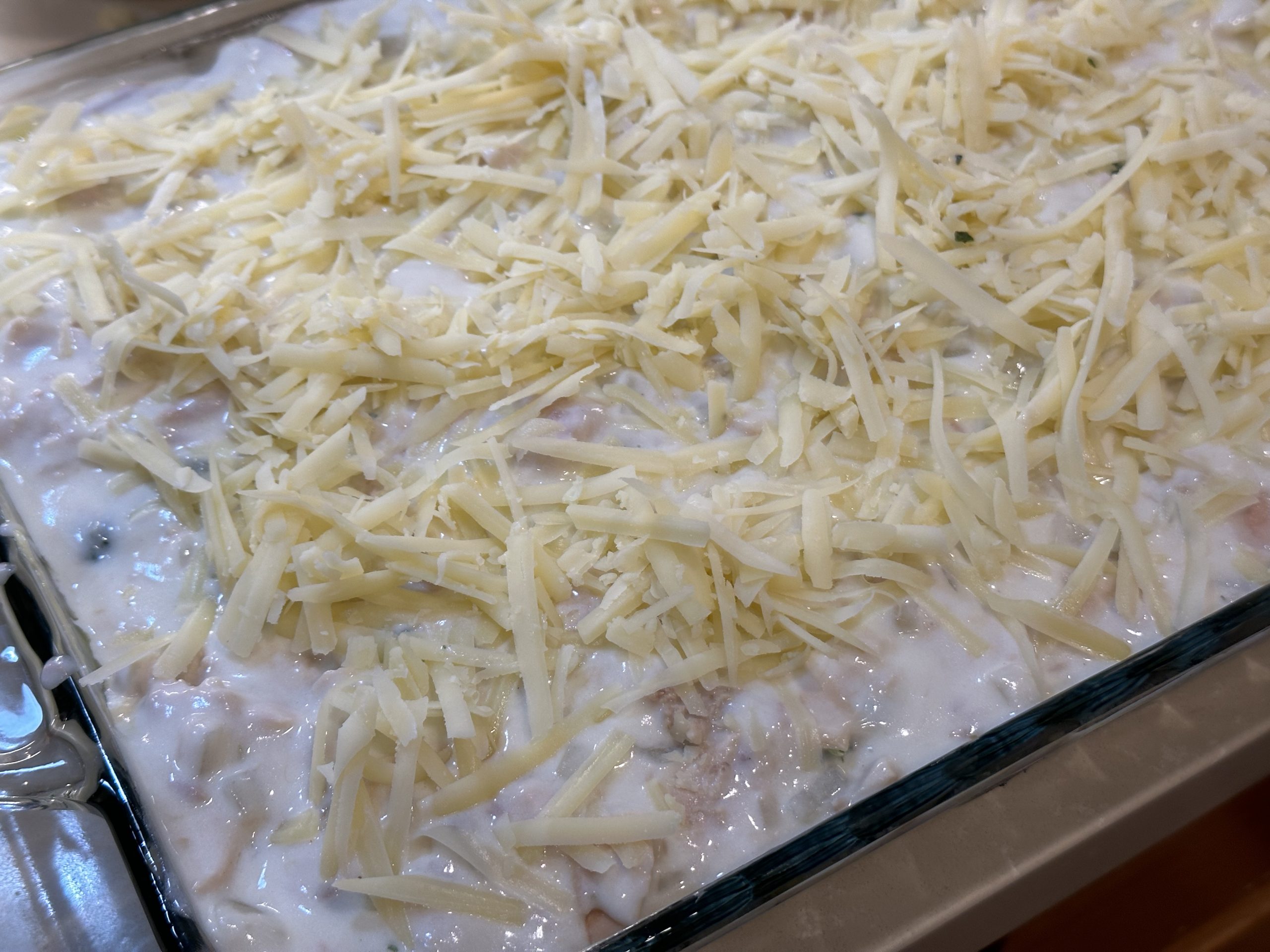 Fold in the solid white tuna fish, breaking it into bite-sized chunks. Add the lemon zest and 1/2 of the cheese. Season with salt and pepper, to taste.