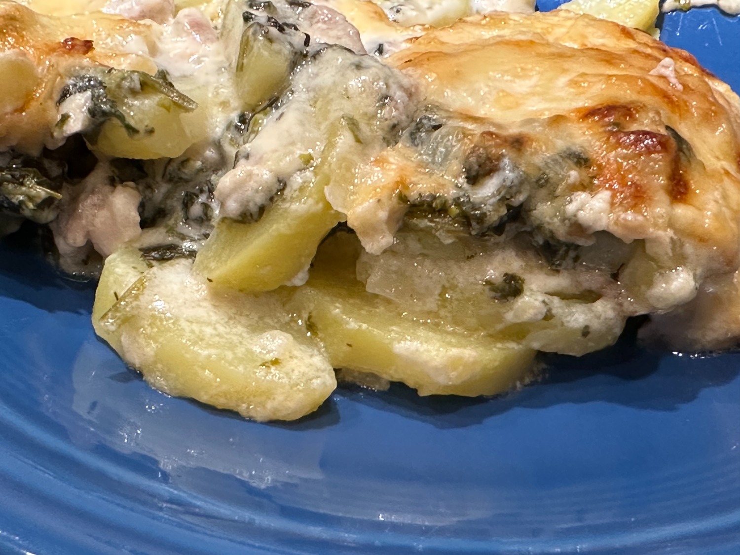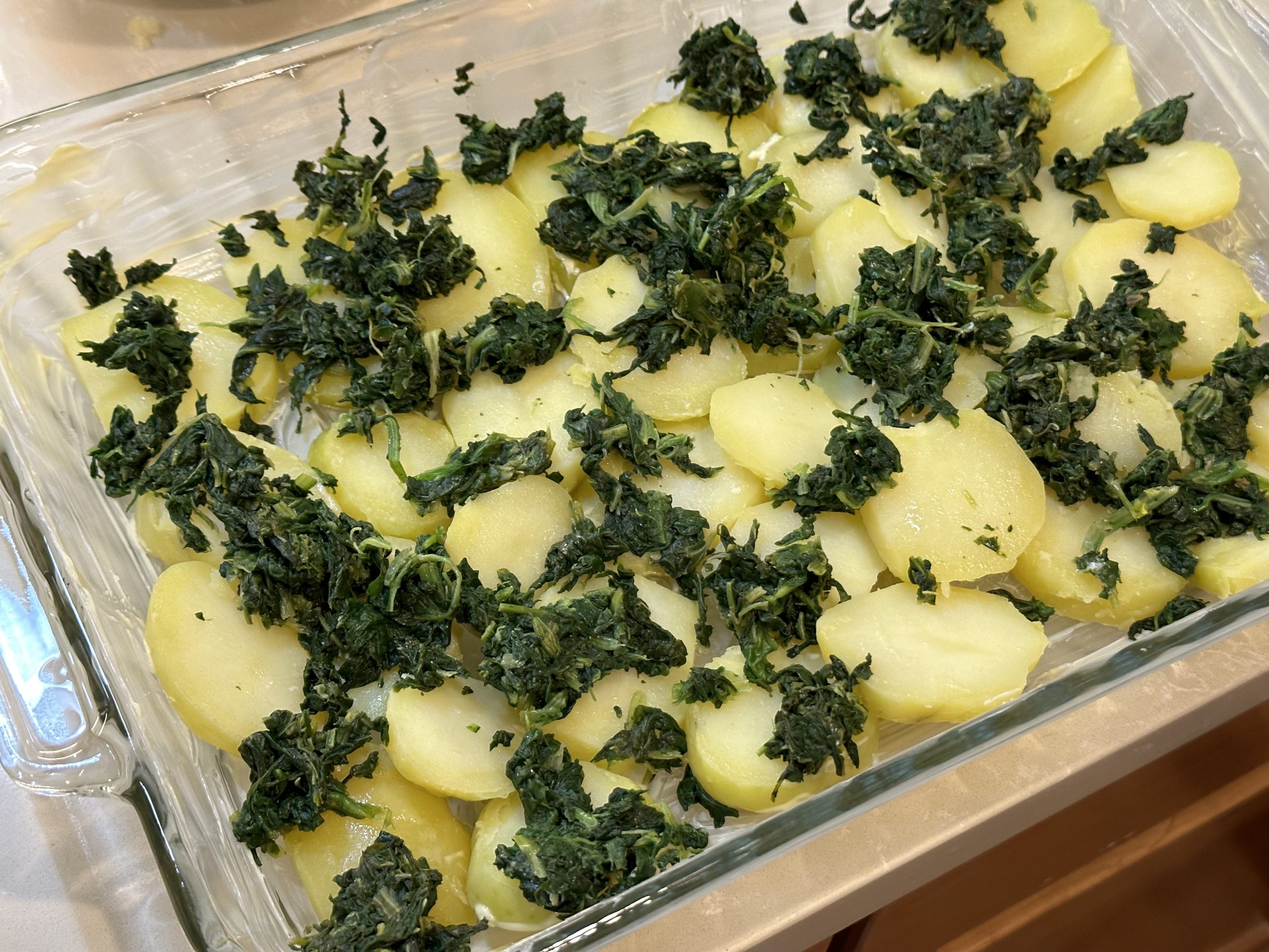 Spread 1/2 of the bechamel as evenly as possible over the potatoes and spinach.